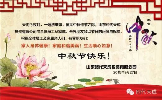 天将今夜月,一遍洗寰瀛,值此中秋佳节之际,山东时代天成投资有限公司向全体员工及家属、各界朋友致以节日的问候与祝福。